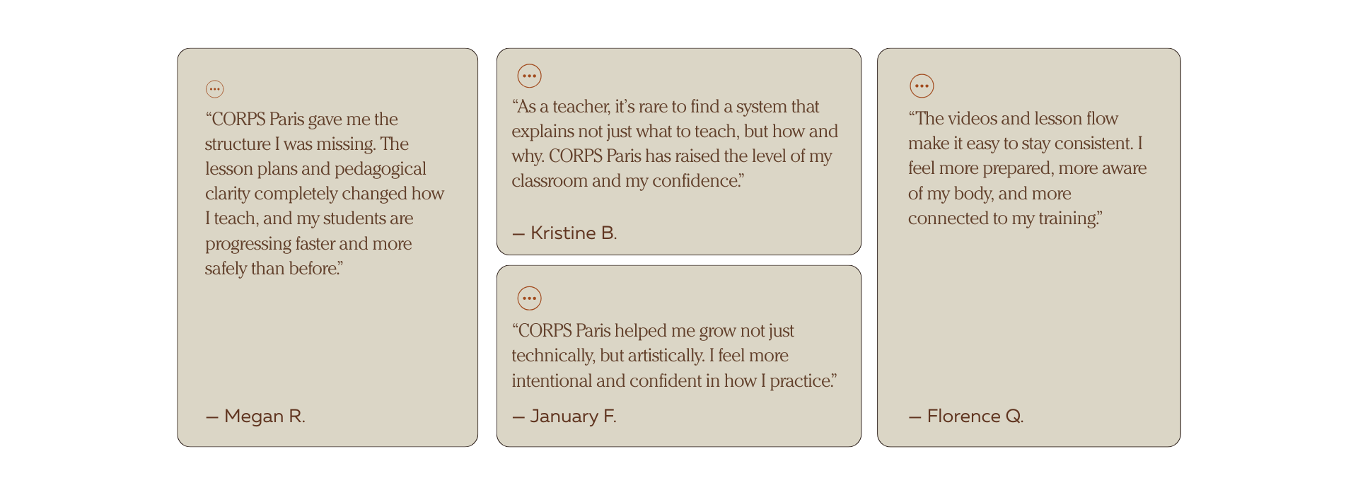 CORPS Paris helps teachers teach with confidence, consistency, and purpose, while building dancers who progress safely and intelligently from the very beginning.